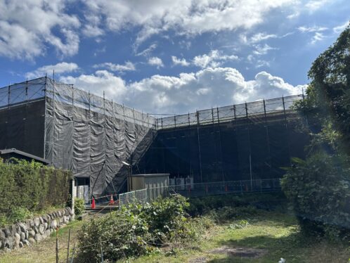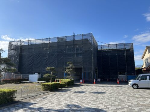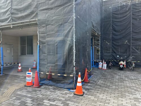 足場と黒い幕で囲われていますが、通常に開校しています。